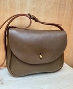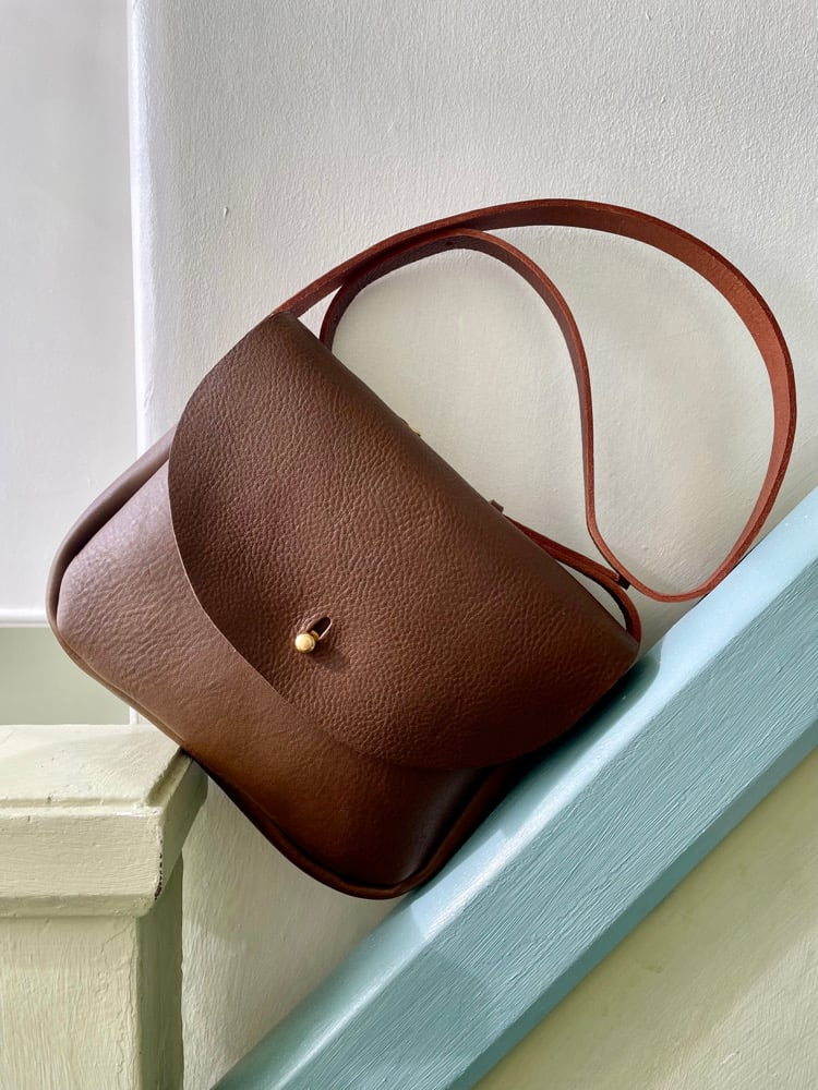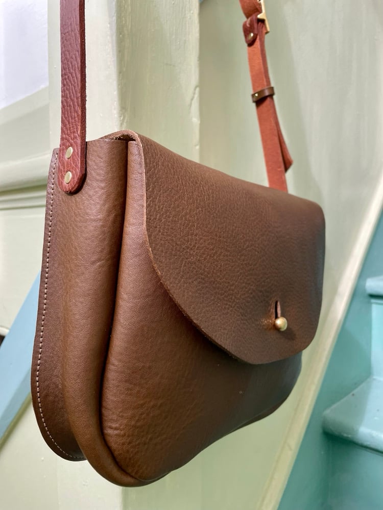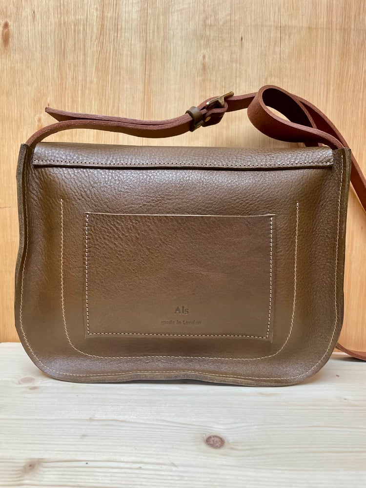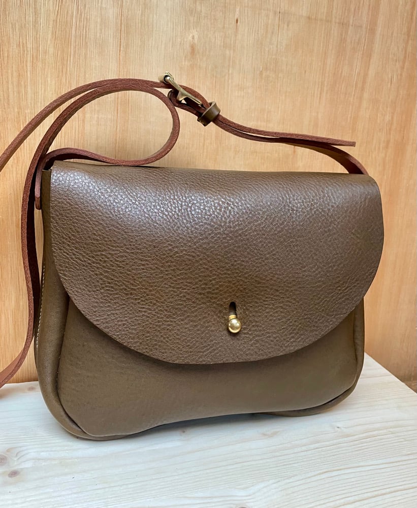 Unlined made in olive coloured full grain, veg tan leather with dark tan leather adjustable strap.